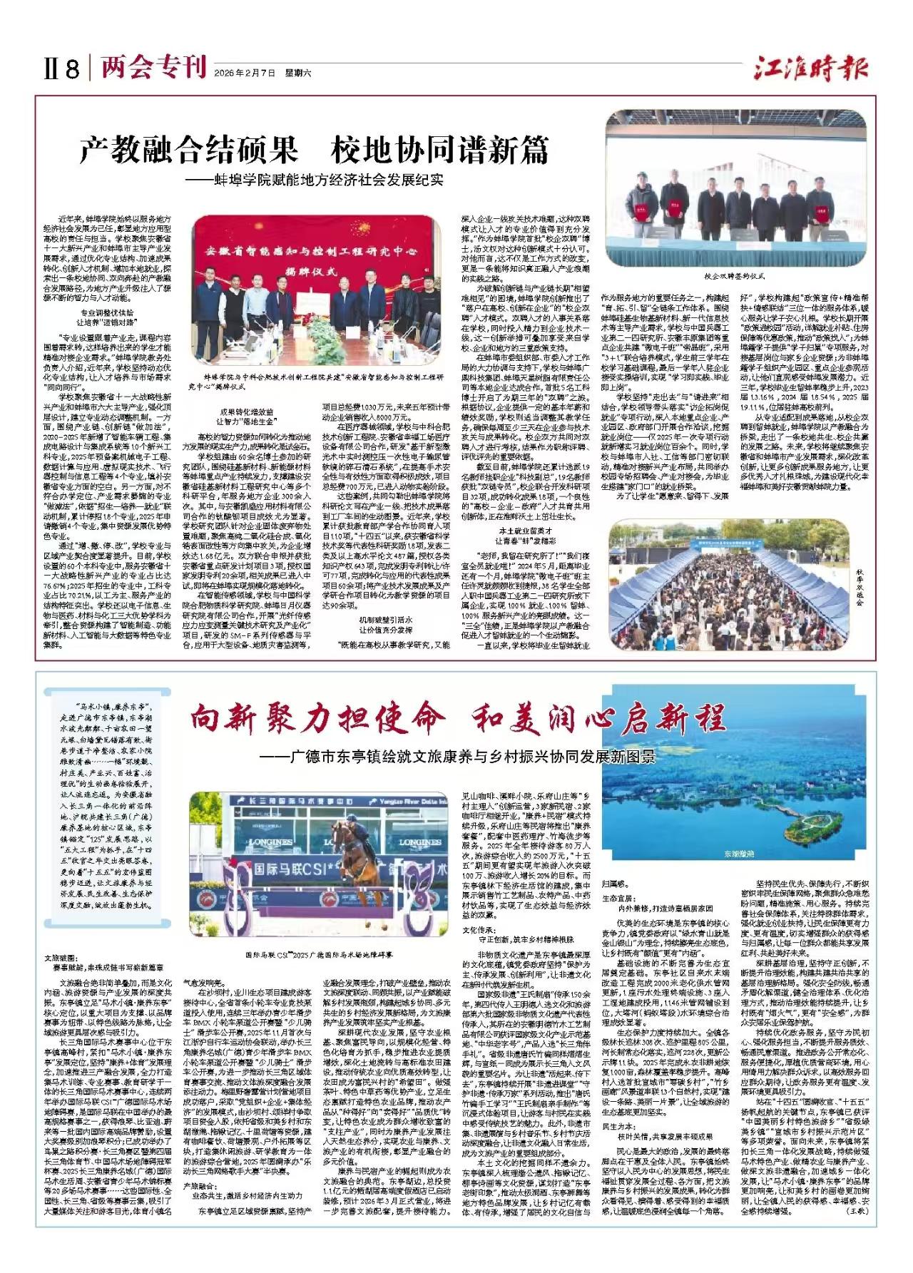 2026年2月7日,《江淮时报》在两会专刊刊发长篇通讯《产教融合结硕果 校地协同谱新篇——bat365在线中国官网登录入口赋能地方经济社会发展纪实》,全面报道bat365官网紧扣地方产业需求、深化产教融合、服务区域高质量发展的创新实践与显著成效,以省级权威媒体视角展现蚌院作为地方应用型高校的责任担当与办学成果。此次报道聚焦bat365官网专业优化、成果转化、人才引育、留蚌就业四大核心板块,系统梳理了学校近年来对接地方产业的务实举措:通过动态调整专业结构...