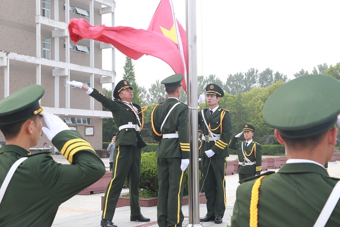七时二十分,郭有强将鲜艳的五星红旗授予国旗班班长刘传奇同学,英姿飒爽的校国旗护卫队队员们护送鲜艳的五星红旗进场,伴随着庄严雄壮的《义勇军进行曲》,五星红旗冉冉升起,迎风飘扬。在场的每一个人向国旗行注目礼,内心充满对祖国的无限热爱和崇高敬意。