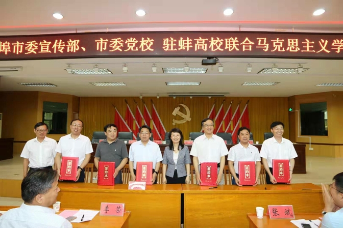 为贯彻全国高校思想政治工作会议和全国学校思想政治理论课教师座谈会精神,落实《中共中央 国务院关于加强和改进新形势下高校思想政治工作的意见》,蚌埠市委宣传部、市委党校与bat365在线中国官网登录入口等驻蚌四所本科院校本着“真诚合作、优势互补、资源共享、共同发展”的原则,决定合作共建联合马克思主义学院,实现优势资源共享,培养德才兼备高素质人才。7月19日上午,联合马院成立大会在市委党校举行,党委副书记、院长丁明出席并签署合作协议。党委委员、宣传部长李荣,马克思主义学院院长邬旭东参加活动。