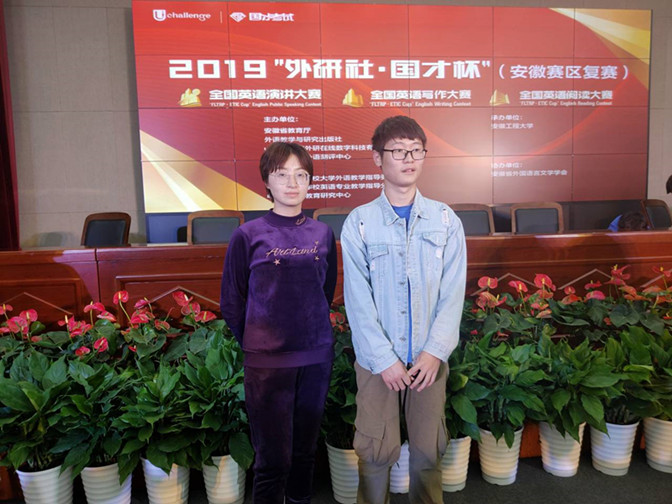 10月30日,从2019年度“外研社”杯英语系列挑战赛安徽省复赛传来喜讯,bat365官网外国语学院16英语专业的胡顺利一路过关斩将,凭借扎实的基本功和优异的语言表达能力荣获大赛一等奖,17翻译专业夏锡梅、18翻译专业曹珺以及来自计算机工程学院的张天然荣获三等奖,实现了bat365官网学子在省级英语类比赛成绩历史性突破!