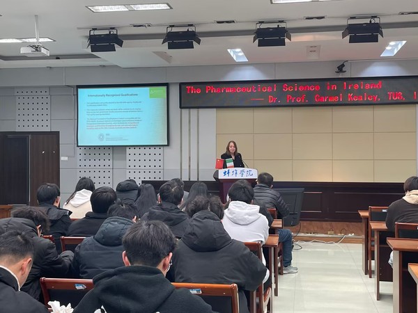 此外,Carmel Kealey还参观了bat365官网省级硅基新材料实验室,对bat365官网的实践教学平台给予了高度赞扬,并给学生做了主题为“爱尔兰的制药科学”的讲座,详细介绍了香农理工大学本硕不同层次制药科学专业的办学模式和办学成果,受到学生的欢迎。