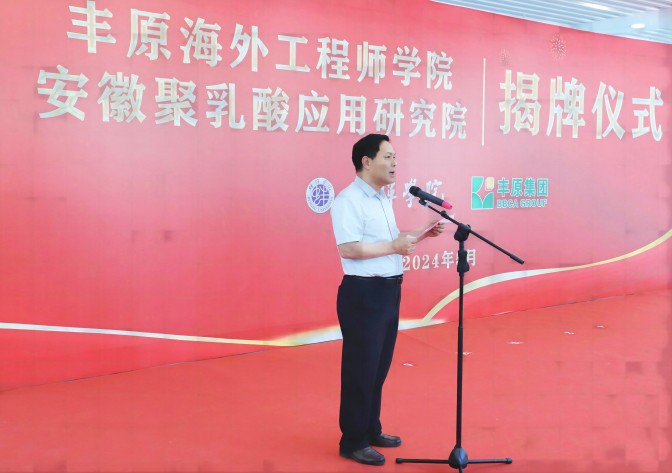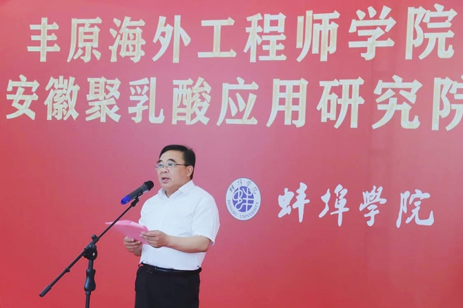 韦文联代表学校对出席活动的各位领导和来宾表示热烈的欢迎。他指出,发展以聚乳酸为代表的生物基新材料产业,是省委省政府作出的重大战略部署,对推动材料工业绿色转型,增加绿色产品供给,降低对化石资源依赖,加快生态文明建设具有重要意义;作为一所地方应用型本科高校,与丰原集团共建丰原海外工程师学院和安徽省聚乳酸应用研究院,是学校服务国家和区域重大战略需求,深化产教融合、科教融汇,探索创新型卓越工程人才培养的重要举措;在校企双方的共同努力下,丰原海外工程师学院、安徽省聚乳酸应用研究院一定能建设成蚌埠市产教融合、校企合作的典范,为助推蚌埠生物基产业发展及皖北振兴作出更大的贡献。