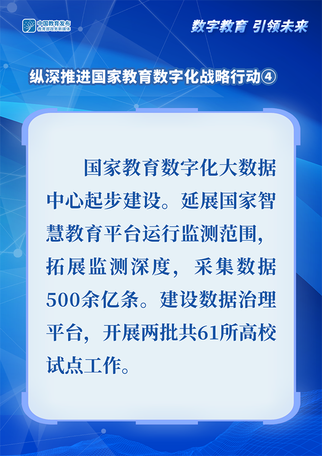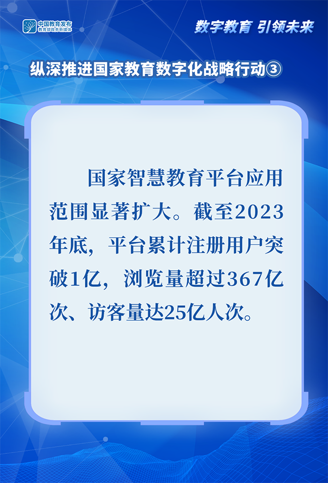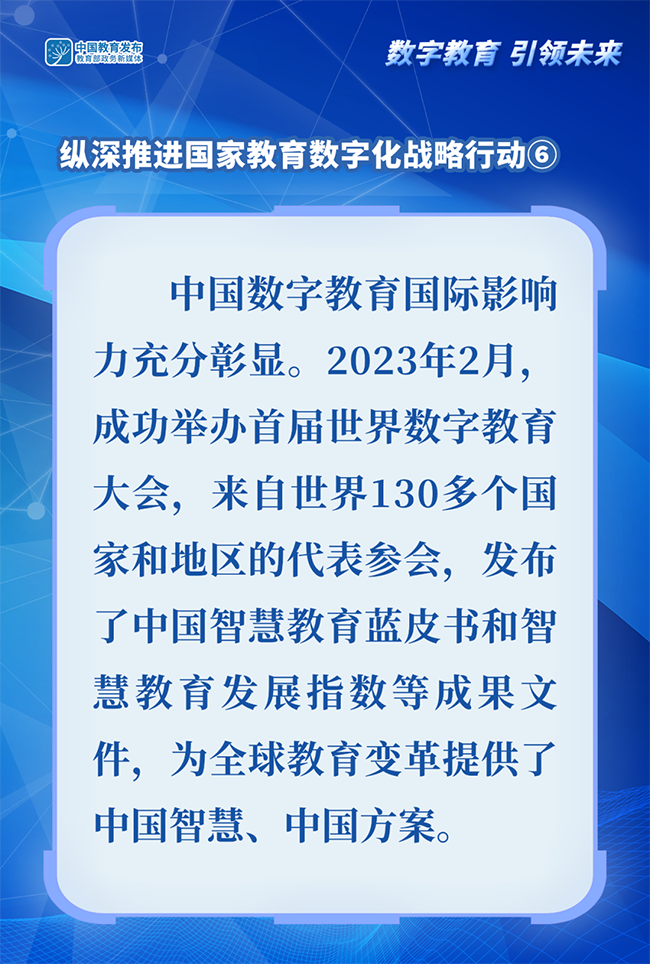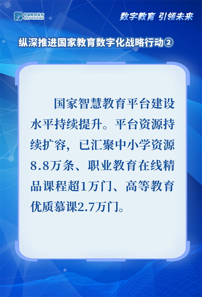 2024世界数字教育大会于1月29日-31日举办。教育部政务新媒体推出系列图解,带你了解我国推进教育数字化工作和建设学习型社会、学习型大国相关举措。今天一起看如何纵深推进国家教育数字化战略行动——