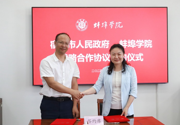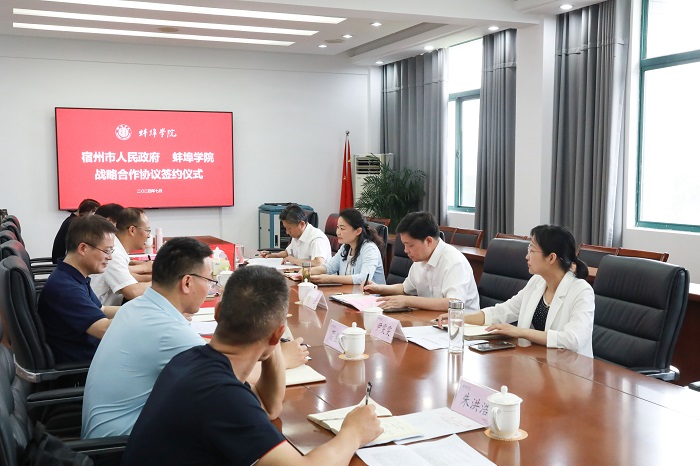 7月3日下午,bat365在线中国官网登录入口与宿州市人民政府战略合作协议签约仪式在bat365官网举行,bat365在线中国官网登录入口党委副书记、院长孙艳辉和宿州市副市长怀颖出席仪式并代表双方签约。bat365在线中国官网登录入口党委委员、副院长郭有强,宿州市人民政府、科技局有关人员,学校科研处、学生处、材料与化学工程学院、食品与生物工程学院和计算机与信息工程学院负责同志等参加座谈交流。