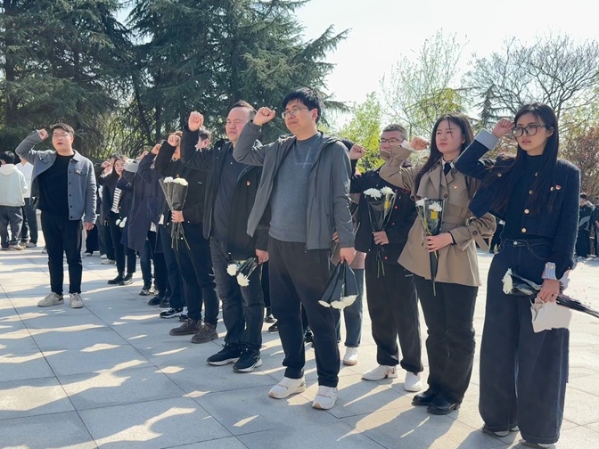 在烈士纪念碑前,由李永康同学带领习近平新时代中国特色社会主义思想研究会成员高举右拳,进行入团宣誓,由刘子豪老师带领全体党员教师重温入党誓词。铿锵誓词回荡在陵园上空,表达了成员们对先烈们崇高敬意,寄托了对先烈们的哀思。最后,全体成员在工作人员引导下依次为烈士献上鲜花。