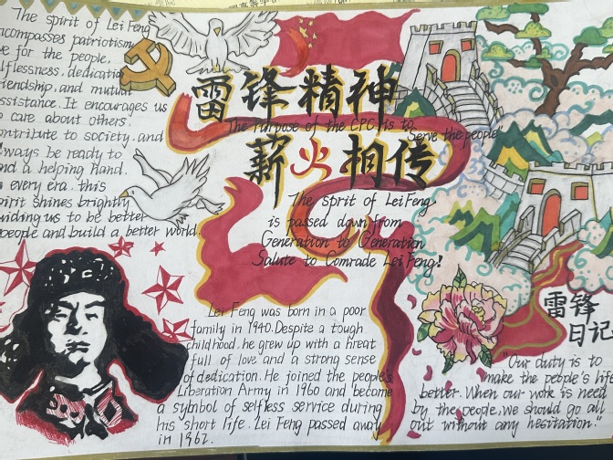 传承雷锋精神,汇聚青春能量:活动一---举办“雷锋月”英语主题手抄报活动。活动期间,同学们热情高涨,积极参与。在绘制过程中,彩笔在同学们手中飞舞,一幅幅精美的手抄报逐渐成型。有的同学用细腻的笔触描绘雷锋做好事的场景,有的同学则用简洁有力的文字阐述雷锋精神的内涵。此次活动的成功举办,不仅为学生提供了展示自我的平台,也让雷锋精神在校园里生根发芽,激励着更多学生在新时代传承和弘扬雷锋精神,以实际行动书写新时代的雷锋故事。