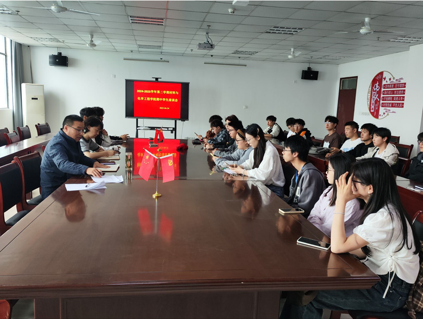 2025年4月24日,材料与化学工程学院举办了期中教学检查教师、学生座谈会,学校教学督导黄世瑜出席座谈会,学院党委书记张敏、院长葛金龙、党委副书记朱银邦和各专业教师代表、学生代表参加座谈会,会议由葛金龙主持。