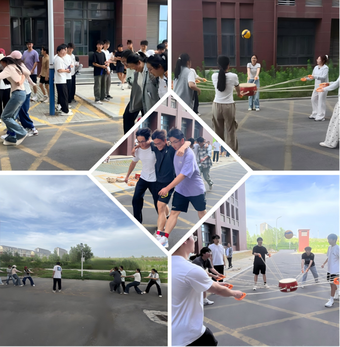 赛场上,气氛热烈紧张。在三人四足比赛中,队员们两两并排,绑紧相邻双腿,齐心协力迈向终点。他们的步伐逐渐稳健,配合愈发默契,每一步都诠释着团结的力量。同心鼓颠球环节,宿舍成员围成一圈,手持同心鼓,努力让球连续颠起。当球在鼓上欢快跃动,现场响起阵阵欢呼;拔河比赛将活动氛围推向高潮,队员们双手紧握绳子,脚顶着脚,身体向后倾,拼尽全力为自己宿舍争夺荣誉。