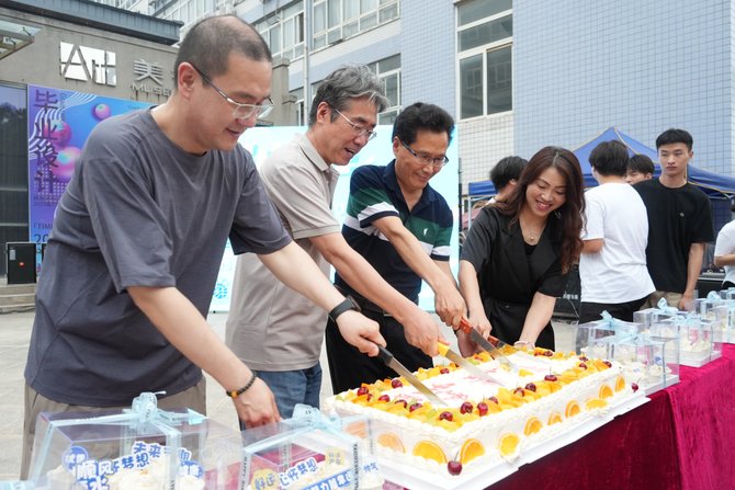 在文创市集特设的打卡集章环节,毕业生参观美术馆毕业设计展的同时,集齐四枚印章即可兑换象征甜蜜与祝福的毕业蛋糕。这份独特的“毕业甜点”,寓意切开过往的丰厚积淀,共享未来的璀璨辉煌,饱含同窗之谊与师长之恩。