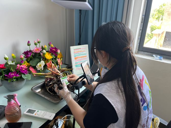 在指导老师黄显兵的帮助下,团队与当地电商公司负责人杨灿取得联系,参观了位于西朱村的睡莲直播基地。走进直播间,团队成员详细了解了当地睡莲的种类、习性、种植要求等,组建了一支直播小队在专业人员的指导下开展了为期一周的直播活动,通过现场展示、互动答疑的方式生动呈现睡莲的独特魅力。