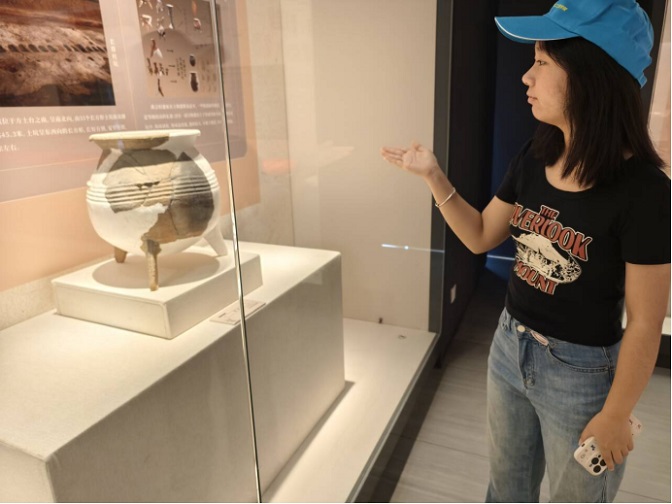 展厅中央的智慧展台全方位储存了展厅内各类文物的外貌细节,土层中遗存的文物痕迹、出土的陶器碎片,让实践员直接近距离观察触摸到远古文明。团队成员通过智慧展台中的专家讲解,用模型演示、场景还原,了解先民制作陶器、耕种狩猎的生活图景。“以前在课本里看双墩遗址,今天亲手摸‘碎片’、听符号含义,才懂咱淮河文明多厚重。”汪希乐同学说道。