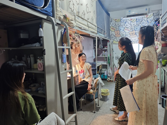 教室检查结束后,高善春又带领全体学工人员前往学生宿舍,深入了解学生新学期报到情况与住宿生活状态。每到一间宿舍,学工人员都与学生亲切交谈,详细询问新学期报到是否顺利、行李物品是否安置妥当,同时仔细检查宿舍卫生状况、消防安全设施以及水电使用情况,提醒学生注意用电安全、保持宿舍整洁,避免违规电器使用。对于部分提前返校的学生,高善春还关切地了解其假期生活与学习规划,鼓励大家尽快调整状态,以饱满的精神迎接新学期的到来。