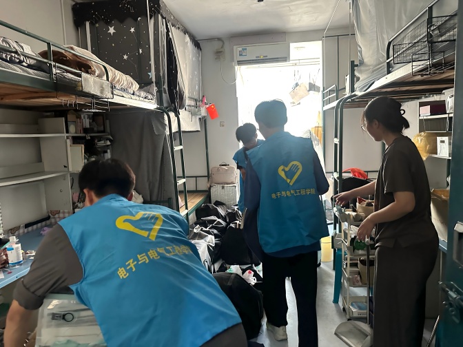 活动当天,志愿者们身着印有“电子与电气工程学院”字样和爱心图案的蓝色志愿马甲,分工明确,配合默契,从衣物、书籍到生活用品,每一件物品都被认真对待,仔细打包、标记,确保在搬运过程中不会损坏或丢失。对于一些体积较大、重量较重的行李,志愿者们更是齐心协力,共同搬运,展现出了强大的团队凝聚力。学院也提前准备了充足的饮用水、防暑药品、搬运工具等物资,并安排专人负责现场协调和应急处理,确保搬迁工作能够安全、有序、高效地进行。