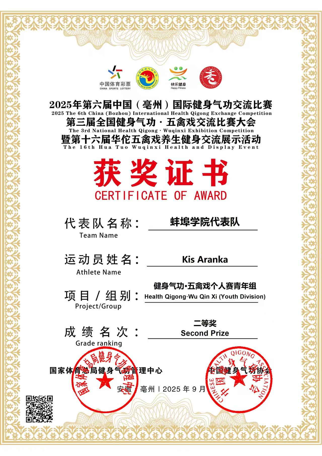 在近期的第六届中国(亳州)国际健身气功交流比赛中,bat365官网匈牙利籍教师Kis Aranka凭借出色的演绎和对健身气功的深刻理解,荣获二等奖,不仅为学校增添了光彩,也为中外文化交流搭建了新的桥梁。