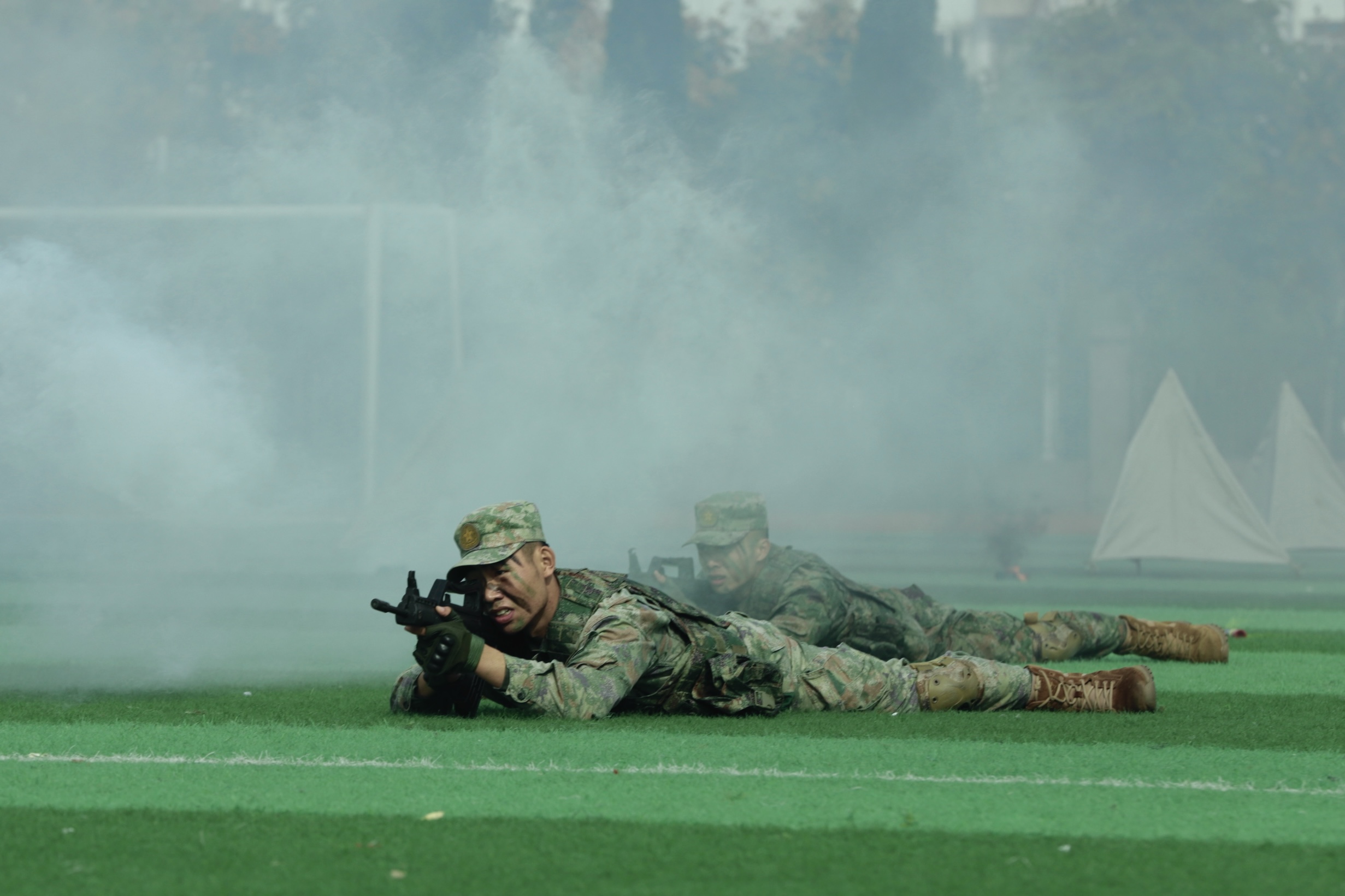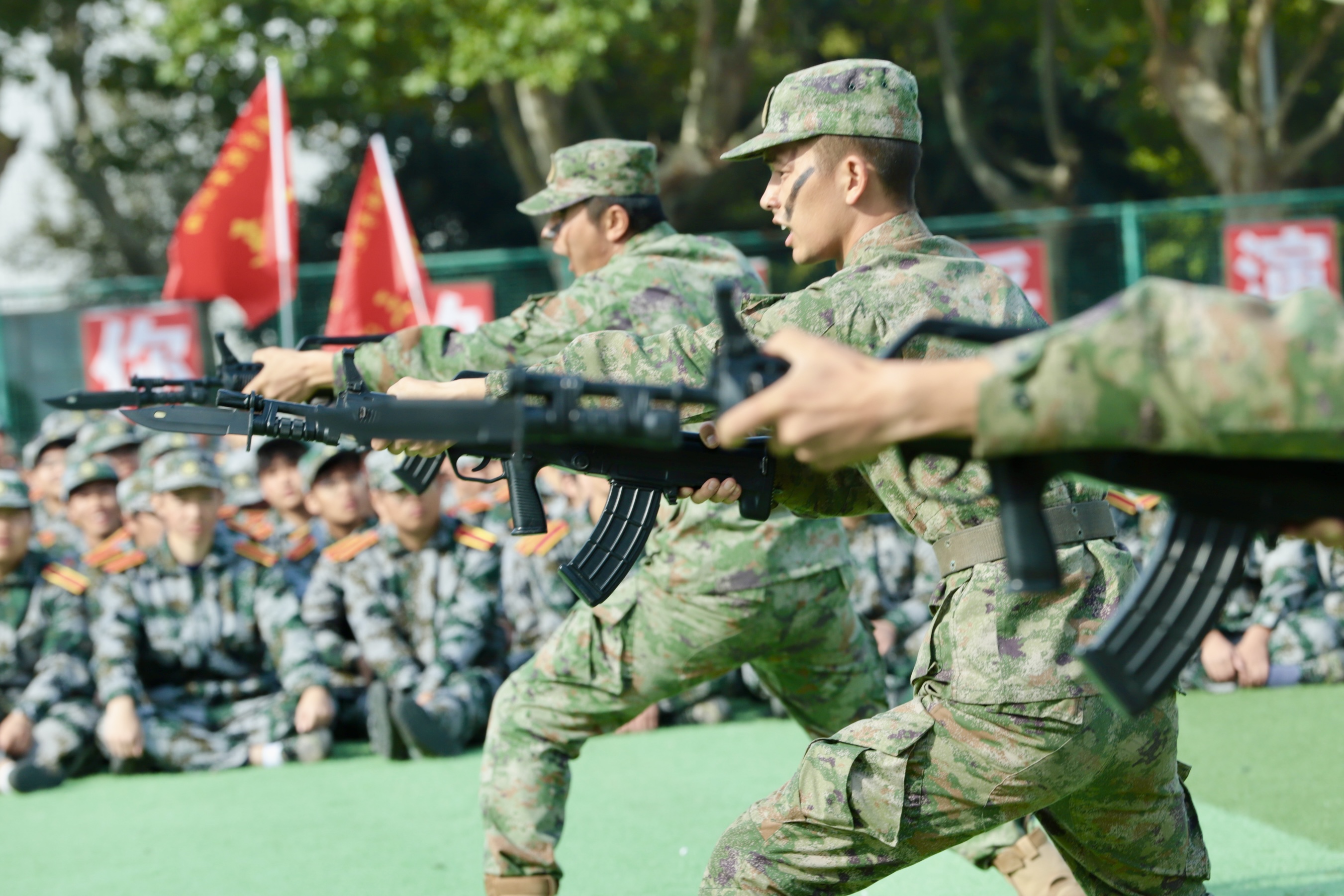 军事科目演示环节中,教官方队展示了标准的枪刺动作,并带来了精彩纷呈的实战化军事演练。在模拟战场环境下,教官们展示了侦察渗透、战术协同、突击攻坚等实战技能,其精湛的军事素养和英勇的战斗作风,让现场师生深切感受到新时代军人的使命担当。