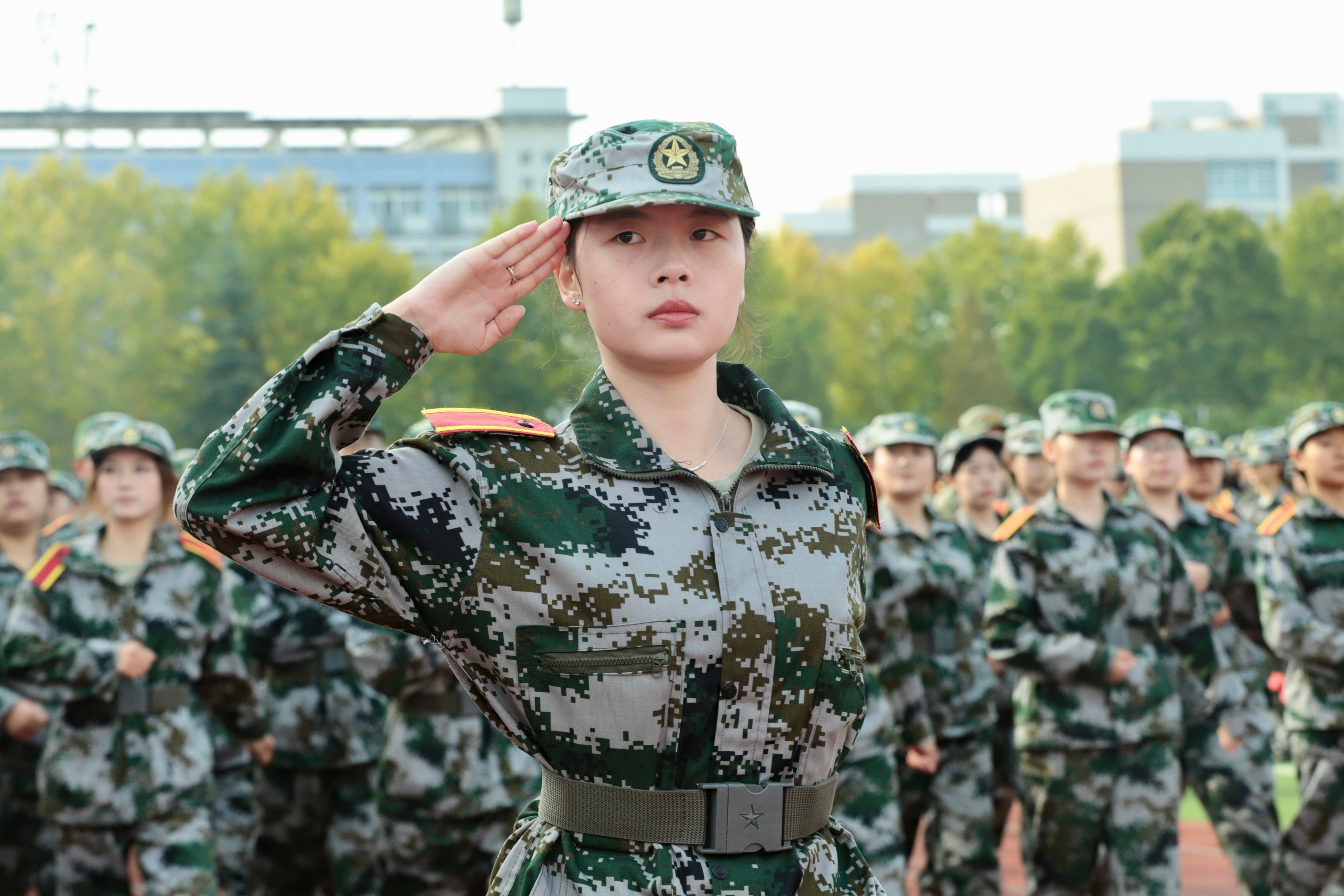 女子方阵带来的枪刺训练展示动作整齐、英姿飒爽。阳光下,她们目光坚毅、身姿挺拔,既有巾帼不让须眉的飒爽英姿,又展现出新时代女大学生的自信与力量。