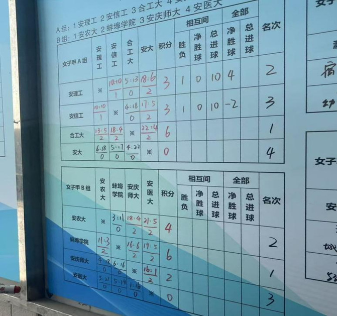 在另一小组(A组)的角逐中,合肥工业大学女子手球队同样展现出强大实力,在与安徽理工大学、安徽大学、安徽信息工程学院的较量中拔得头筹,获得A组第一。