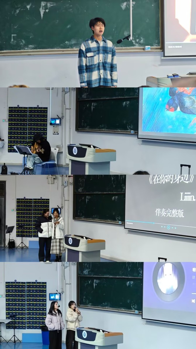 大赛筹备阶段,外院学子们积极报名。比赛曲目风格多样,异彩纷呈。既有深情款款的经典歌曲《爱情闯进门》,也有活力四射的流行歌曲《期待爱》《素颜》;有特色鲜明的弹唱《有我呢》《雨燕》,也有英文歌曲《Fortnight》。选手们不仅在比拼唱功,更是在用心诠释每一首作品背后的故事与情感。舞台上,灯光随着音乐的节奏变幻,映照着一张张充满朝气与自信的面庞;舞台下,观众们不时用最热烈的欢呼声为台上的每一位歌者加油鼓劲,整个现场化作一片温暖璀璨的“星河”。经过近两小时的激烈争夺,评委们从音准、节奏、舞台表现力等多个维度进行综合评定,最终评选出本届大赛的“十佳歌手”。颁奖环节,评委们为获奖选手颁发荣誉证书,肯定其在舞台上的精彩表演,鼓励学子们持续用艺术之美丰富校园生活。