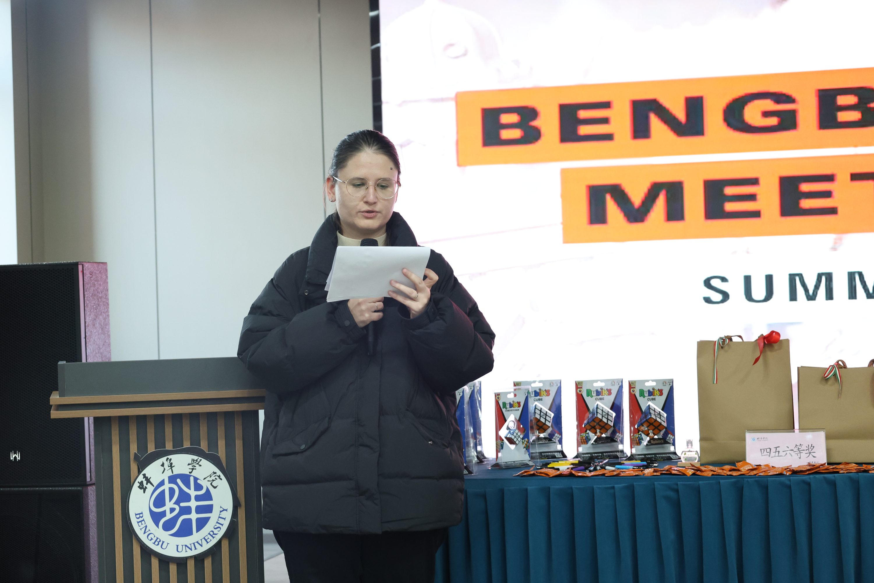 活动下半场由bat365官网匈语教师杨缇娜(Yang-Lovas Krisztina)主持。她详细地向学生们介绍了比赛规则:参赛者需在10分钟内,根据展示板的内容完成一份包含20道题的测试。同学们的参与热情高涨,最终25机制1班的方宁等同学脱颖而出,荣获一等奖。来自机械与车辆工程学院、经济与管理学院、计算机与信息工程学院、艺术设计学院等不同学院的同学们分别荣获了二、三、四、五、六等奖。卡帕缇•约瑟夫和爱丽丝老师为获奖同学颁发了魔方、圆珠笔等具有匈牙利特色的奖品。