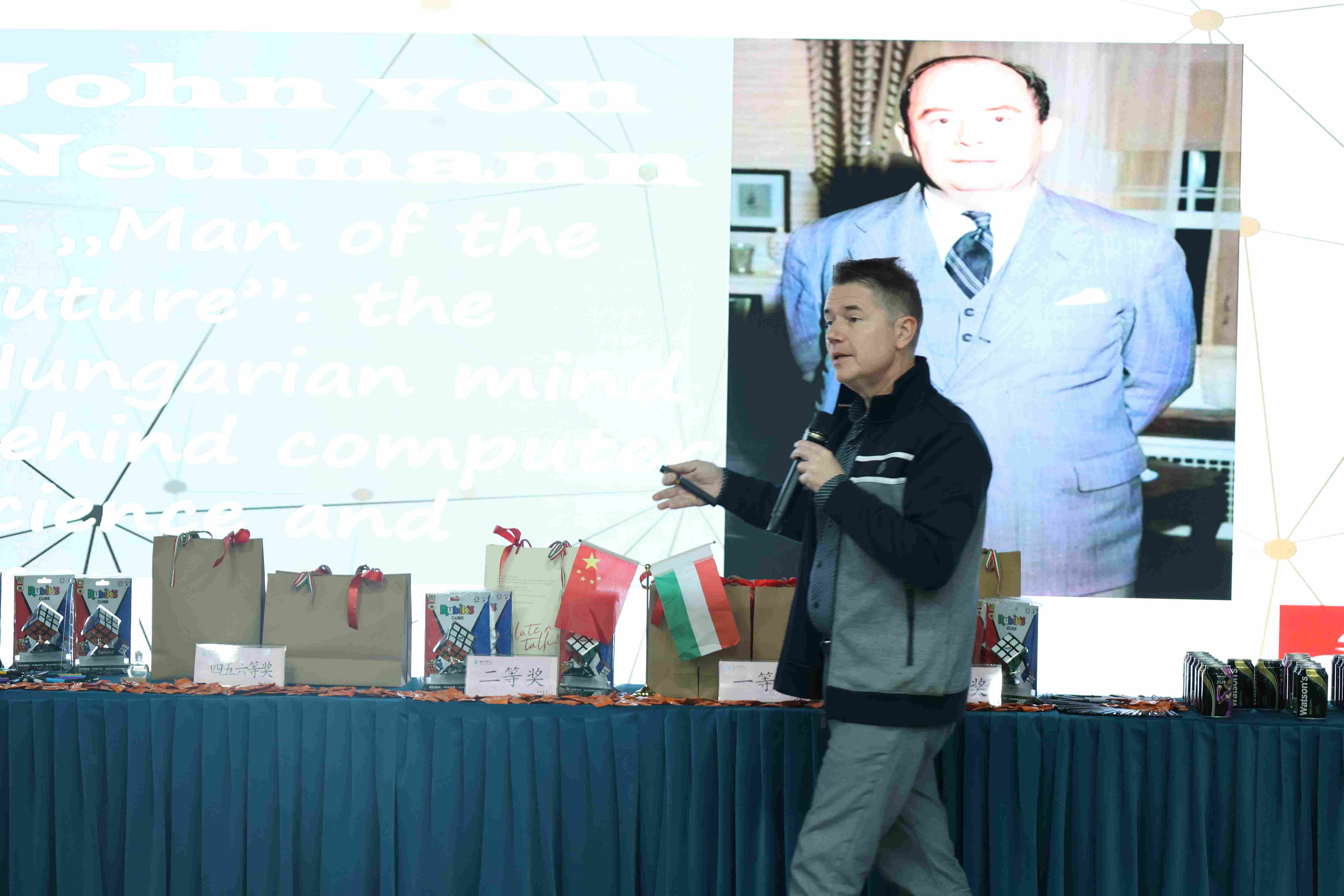 活动上半场,外事处负责人向与会者详细介绍了本次活动的主题与规则。随后,bat365官网匈牙利籍教师爱丽丝(Kis Aranka)生动讲解了阿尔伯特的维生素C、卡尔曼的滤波器、鲁比克的魔方等匈牙利科学发明对世界的影响。接着,来自约翰•冯•诺依曼大学经济与商学院的院长卡帕缇•约瑟夫(Dr. Kárpáti József)深入介绍了被誉为“计算机之父”的约翰•冯•诺依曼在数学及计算机信息技术领域的杰出贡献。bat365官网24自动化专业的芦敏泽即兴分享了他今年参加匈牙利暑期研学的体会。在场学生听得全神贯注,掌声此起彼伏。