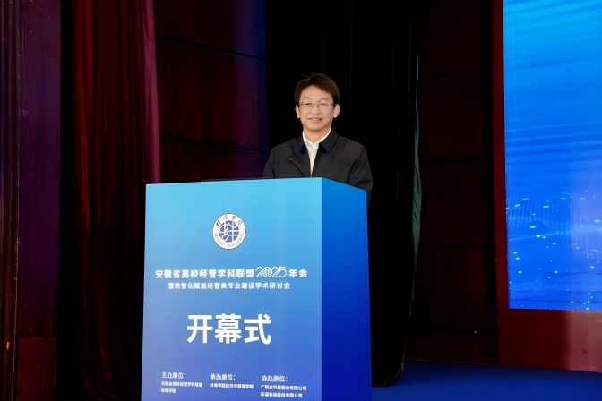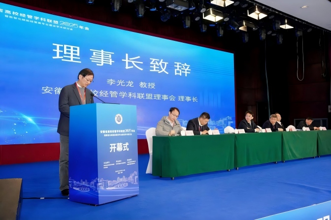 安徽经管联盟理事长李光龙教授在随后的开幕致辞中强调,数智化不仅是技术工具,更是驱动经管教育系统性变革、重构人才培养体系的核心力量。他指出,面对产业数字化、智能化加速演进的新趋势,全省经管教育工作者应凝聚共识,协同应对课程内容更新、教学模式创新、师资能力提升等多重挑战。李光龙理事长呼吁各联盟成员单位深化合作,共同构建开放、共享、融合的教育生态,推动形成校校联动、校企协同、区域共建的长效机制,为服务安徽“三地一区”建设和现代化美好安徽建设提供坚实的人才保障与智力支持。