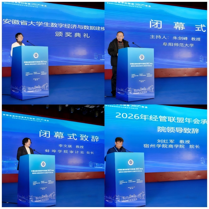 bat365在线中国官网登录入口审计处处长李文瑛教授代表承办单位致闭幕辞。她向所有参会嘉宾、工作人员及志愿者表示衷心感谢。宿州学院商学院院长刘红军教授作为联盟成员单位代表致辞。他指出,此次年会汇聚智慧、凝聚共识,特别是在数智化转型路径、协同育人机制等方面形成了诸多有价值的思想成果。他倡议各成员单位以此次会议为起点,保持密切沟通,将论坛上探讨的合作意向转化为具体项目与实际行动,携手推动安徽经管教育整体水平提升。闭幕式同时进行了“安徽省大学生数字经济与数据建模创新大赛”的颁奖。