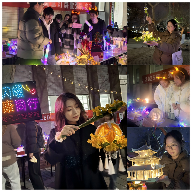 LED灯展在图书馆后广场展开,现场陈列着参赛选手精心设计的灯展作品。这些灯光造型巧妙融合红色元素与专业特色,或用灯带勾勒山河壮阔轮廓,或用灯组点亮时代发展符号,夜色中交织成一片璀璨的光影世界。灯展现场由学院组织部等部门组织志愿者,有序引导师生参观,大家纷纷驻足观赏、拍照打卡,在光影艺术中触摸时代发展的轨迹。