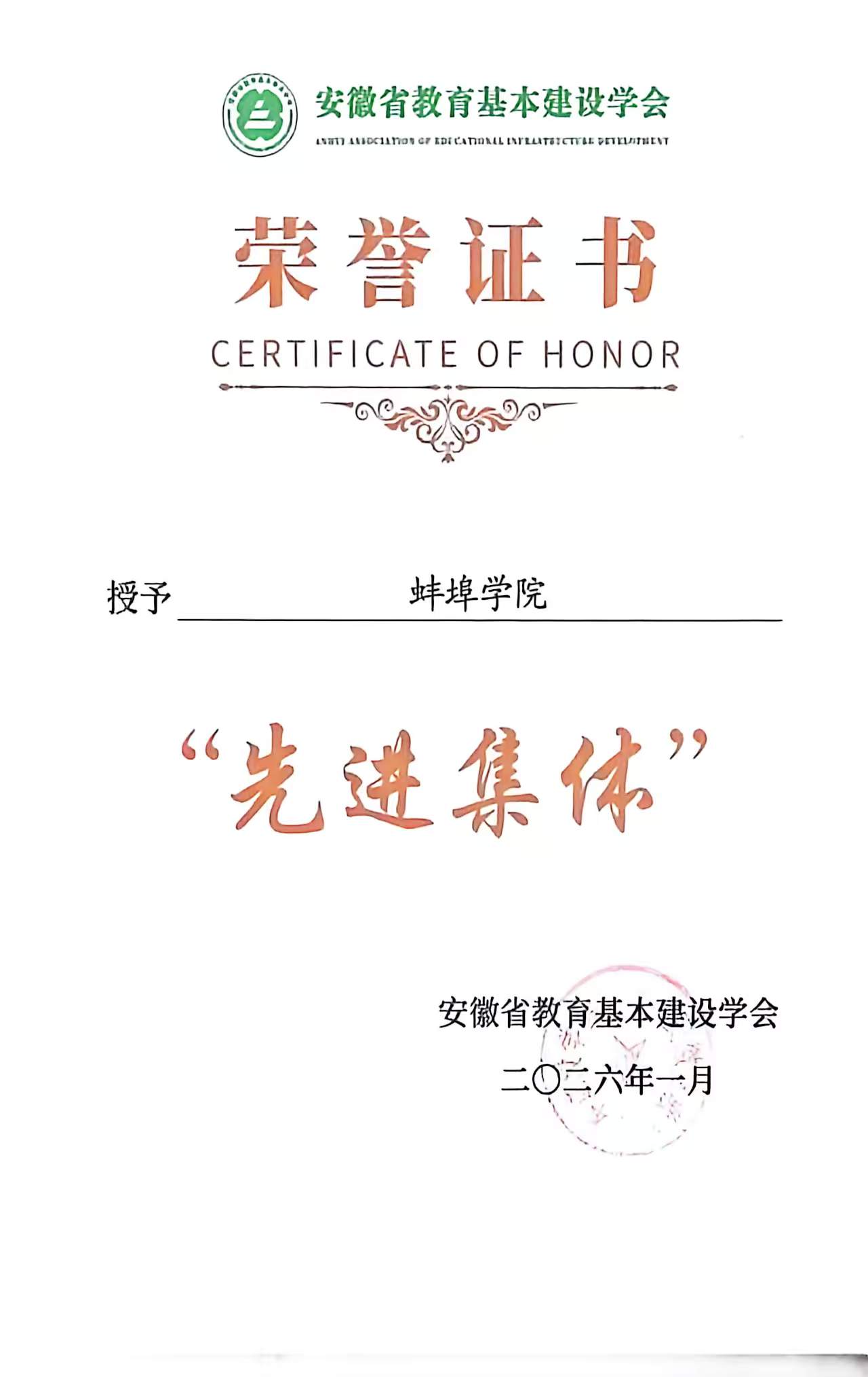 2026年1月16日,安徽省教育基本建设学会第七次会员代表大会在合肥召开,学校基建处一行赴合肥参加会议。学校获评安徽省教育基本建设学会“先进集体”。