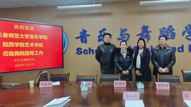 1月27日,长春师范大学音乐学院院长马珂教授、皖西学院艺术学院副院长陈燕杰、专业负责人黄梅一行莅临音舞学院指导工作,双方在F612会议室围绕师范专业认证工作展开深度研讨。会议由院长张永芳主持,学院领导班子成员、教研室主任郭千、王莹莹、高一寒,骨干教师佐志刚、李浩然、孙辰及全体教师参加会议。
