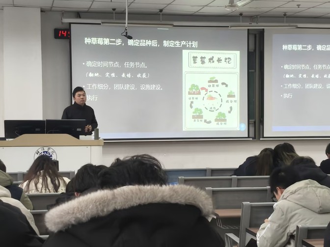 苏双飞结合自身多年深耕草莓产业一线的实践经验,以草莓种植流程为主线,系统阐述了从品种选择、育苗管理到市场定位的全链条逻辑,并将农业思维巧妙迁移至大学生职业规划与成长路径中。他指出,草莓种植的第一步是“选对品种”,对应职场发展则是“认清自我、找准定位”;育苗阶段需“扎根、施肥、防虫害”,启发学生在职业生涯初期注重积累、提升抗挫能力、远离无效消耗;而面对市场波动与自然风险,则要学会“留好备用苗”“重新种植”,培养抗压与应变能力。