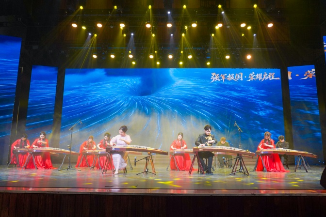 3月14日,“强军报国·荣耀启程”——蚌埠市2026年上半年欢送新兵出征文艺汇演在蚌埠大剧院举行。音乐与舞蹈学院教工党支部书记曹晓亮、常虓带领8位同学代表学校参加演出,以古筝合奏《战台风》为即将奔赴军营、投身国防事业的新兵送上诚挚祝福,以音乐形式礼赞从军报国之志、凝聚强军兴军力量。
