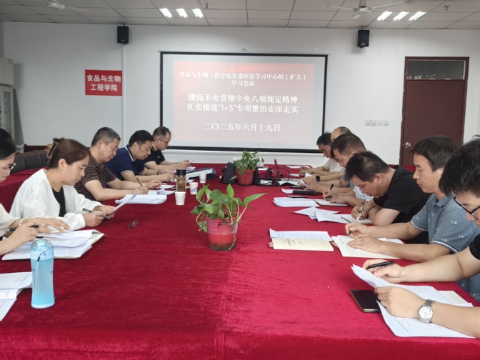 6月19日上午,食品与生物工程学院党委召开以“锲而不舍贯彻中央八项规定精神,扎实推进‘1+5’专项整治走深走实”为主题的理论学习中心组(扩大)学习会。校党委委员、纪委书记、监察专员杨安成到会列席旁听,纪委副书记、纪委办主任王大明参会。会议由食品与生物工程学院党委书记王永斌主持,学院党委理论学习中心组成员、科级以上干部、各党支部书记参加会议。