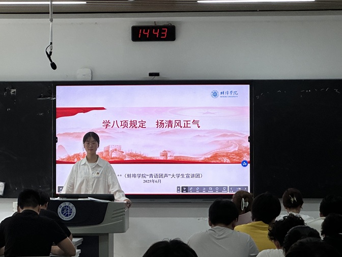 宣讲会深入讲解了八项规定作为改进作风的切入口的重要意义。王舒雅同学详细阐述了八项规定的具体内容,并结合实际案例,分析了违反规定的行为对个人和社会造成的负面影响。王舒雅同学以作风先行是青年成长的指南针,鼓励在场学生干部要将作风建设融入日常学习和生活中,以良好的作风引领个人成长和团队发展,号召同学们要时刻保持清醒头脑,坚守道德底线,做到言行一致、表里如一,以实际行动践行清风正气。