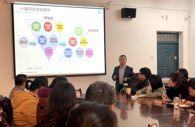 12月10日下午,开云kaiyun体育在学院会议室举办新时代翻译教育及人才培养专题学术讲座。语言服务行业专家、试译宝总经理师建胜应邀以《人工智能时代的翻译教育与翻译人才能力培养》和《人工智能如何助力翻译教学和科研》为题,介绍了语言服务行业的最新发展趋势,分析了人工智能技术对翻译教育的冲击,探讨了新技术背景下翻译人才综合素质的养成,并对翻译专业学生提出了发展建议。结合翻译的教学与研究,师建胜讲解了人工智能的基本原理和人机结合模式及其应用场景,讨论了如何将人工智能应用于翻译教学和科研中,并回答了师生的提问。报告会由人外学院院长师新民主持,学院英语教师代表和2019级MTI研究生聆听了报告。