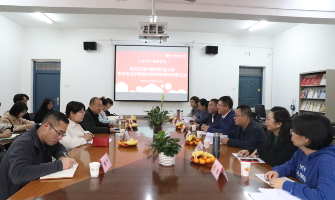 11月12日下午,内蒙古师范大学青年政治学院教务处处长张利峰、基础教育系主任呼和、管理系主任文良、信息工程系主任尤文静、汉语言文学系主任伍涑华、外语系旅游英语教研室主任刘琼等一行来院交流,并与开云官网院长师新民、英语系主任张芸、汉语言文学系主任张辉及学生代表进行了座谈。