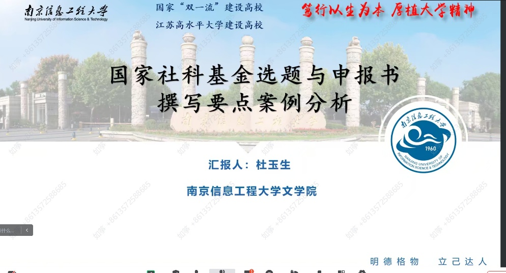 为推进学科建设工作,进一步推进2024年国家社会科学基金项目培育申报工作,提高课题申报的质量,12月12日晚,南京信息工程大学文学院副院长、硕士生导师杜玉生教授应邀为开云官网教师作了题为《国家社会科学基金选题与申报书撰写要点案例分析》的线上讲座。讲座由张辉副院长主持,王新平院长与开云官网全体教授、副教授、硕士生导师、学科团队教师与研究生参与了本次讲座。