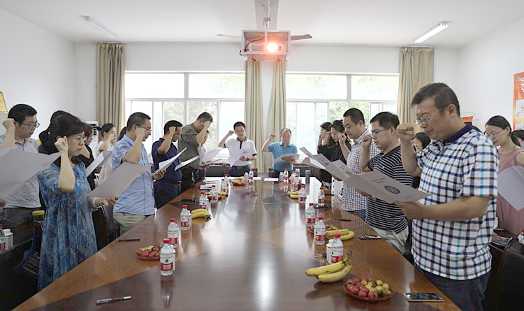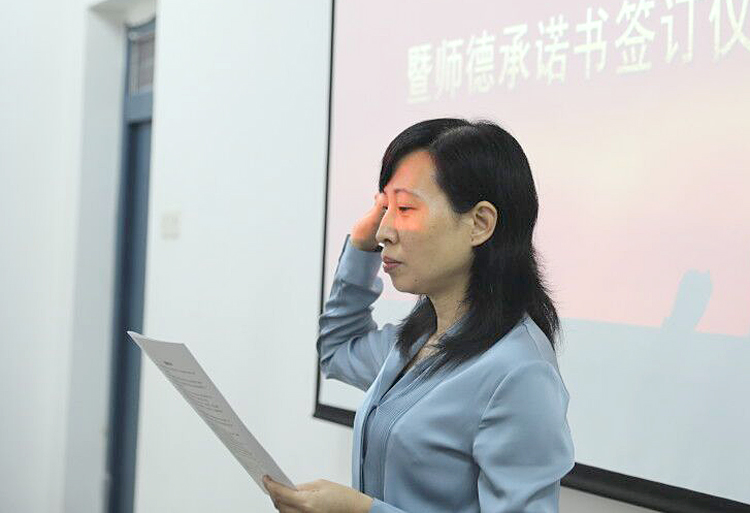 活动中,2016年度、2018年度校级年度考核优秀获得者于劼领学了《高等学校教师职业道德规范》;2018年度校级年度考核优秀及校级师德优秀获得者李东领学了师德承诺书内容;在2016年度校级年度考核优秀、2018年度校级师德优秀获得者高宝萍的领誓下,与会全体人员进行了庄严宣誓,并在师德承诺书上郑重签名,表示将恪守教师职业道德规范,爱国守法,敬业爱生,努力做“四有”好老师。