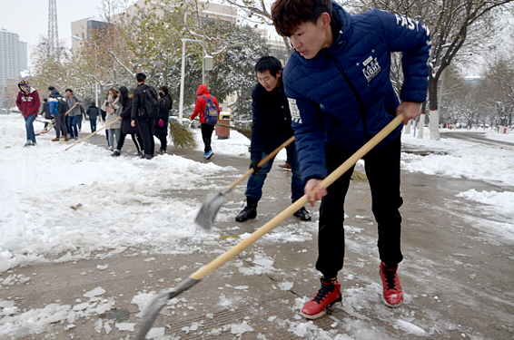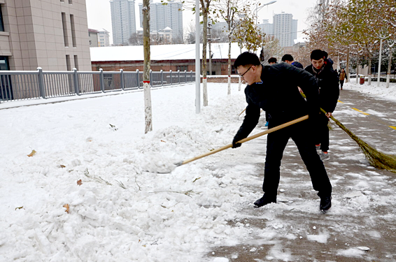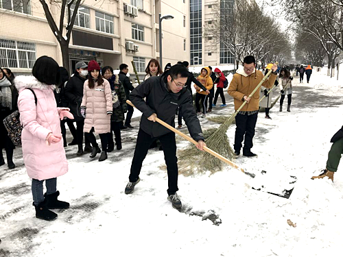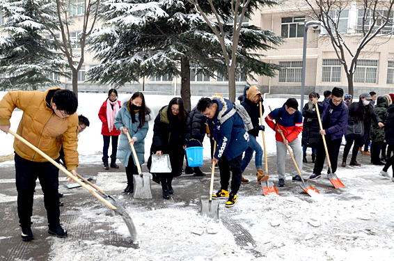 2018年的第一场雪在给大家带来美景与欢乐的同时,也给校园交通和师生的学习生活带来诸多不便。14日,开云kaiyun体育党委积极响应学校号召,组织辅导员老师、分团委学生会干部、全体学生党员、入党积极分子、建档立卡学生及部分没有课的学生开展了扫雪除冰活动。在清扫的过程中,师生们不畏严寒,拿着雪锹、除雪铲、扫帚等工具认真清除冻住的积雪,历经三个小时,将二号教学楼周边的环道清扫一条充满爱心的方便之路,为广大师生的出行安全提供了保障。