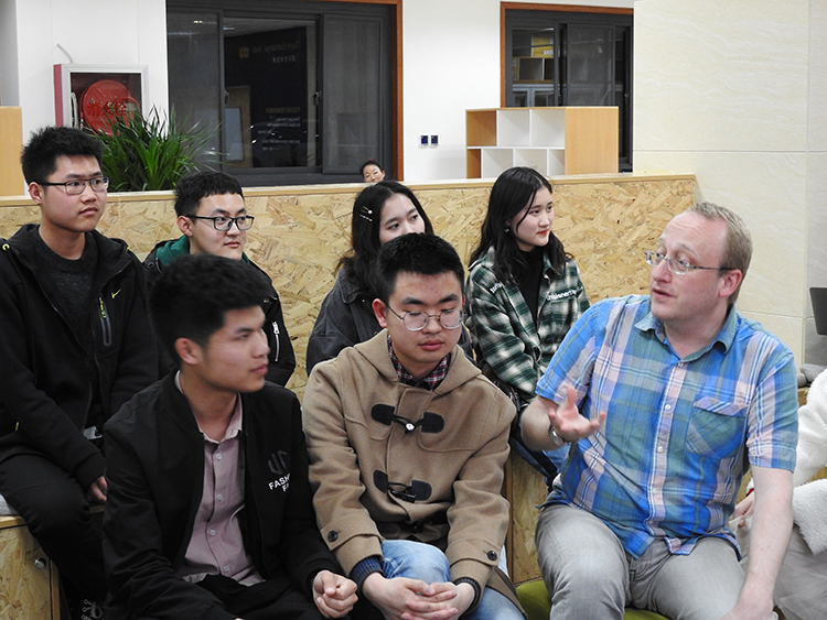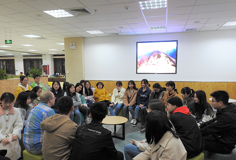 阳春三月,春意渐浓。3月15日晚7点整,开云kaiyun体育新学期第一次“英语角”活动在临潼校区骊山校园图书馆一层创客空间正式启动。本次活动由英语1601班主办,班级全体成员及部分英语爱好者参与活动。外教James与同学们环坐详谈,对同学们感兴趣的留学、工作、国际问题等话题一一展开,进行了认真的分析。