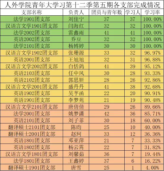 本次青年大学习,法学1901团支部、汉语言文学1901团支部、法学2002团支部、英语2002团支部、法学2101团支部学习率达到100%,8个团支部学习率达到90%以上,2个团支部学习率达到80%以上,但仍有8个团支部学习率没有达到80%,在此,希望本期完成率高的团支部能够再接再厉,而完成率不高的团支部,请各团支书能够起到引领作用,向所有同学强调青年大学习对于个人,对于集体的重要程度,引起大家的思想重视,呼吁并监督大家积极学习视频内容并完成课后习题。积极提高自己的思想觉悟,成为一名跟党走的优秀青年。