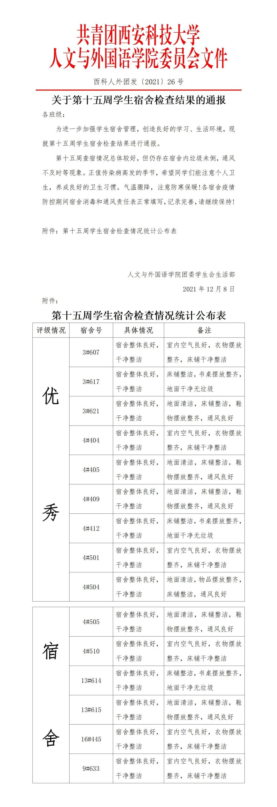 充实的校园生活当然离不开宿舍卫生这一环,通过卫生检查为契机,齐心协力把宿舍卫生环境工作提高到一个新水平,使宿舍达到“亮、净、美”的效果,确保学生在学校健健康康生活而奠定坚实的基础。本次宿舍卫生检查汇总如下: