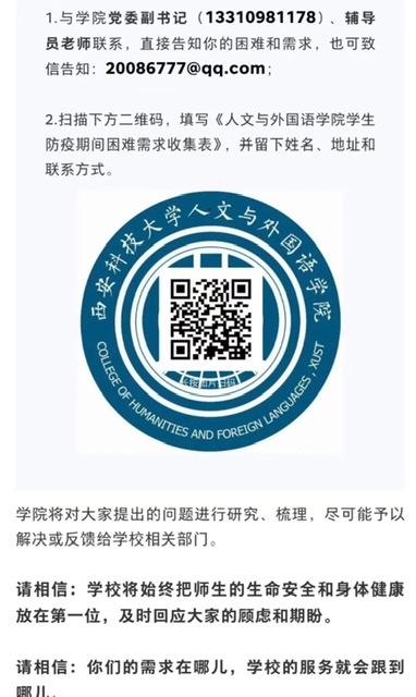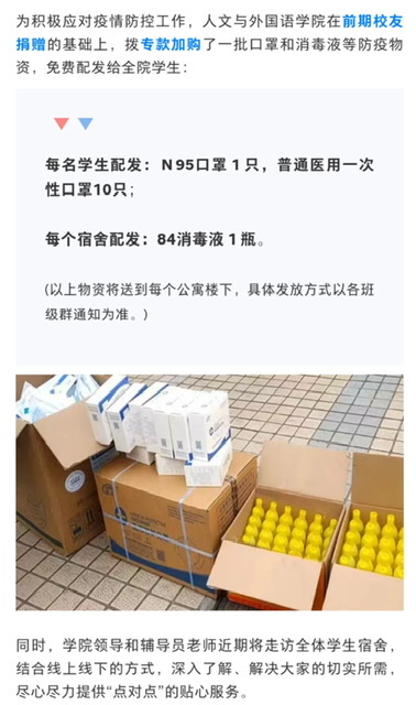 据悉,为帮助同学们顺利度过这段封闭管理期,学院多措并举开展各项人文关怀。除为全院学生免费发放口罩、消毒液等防疫物资外,学院领导和辅导员老师近期还将走访全体学生宿舍,并畅通信息反馈渠道,在网上公布学院领导联系方式和电子信箱,设立《开云kaiyun体育学生防疫期间困难需求收集表》,结合线上线下的方式,深入了解、解决大家的切实所需,尽心尽力提供“点对点”的贴心服务,以保障学生学习和生活有序进行。