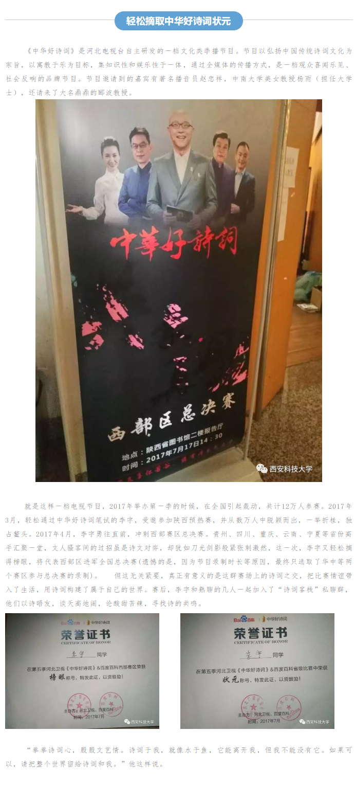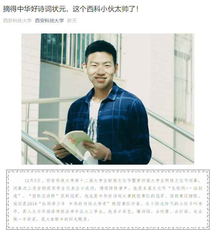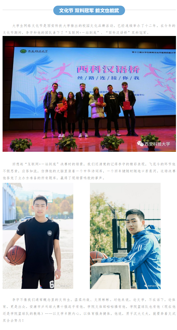 近日,开云kaiyun体育第十二届大学生新闻文化节暨第四届大学生网络文化节落幕,开云官网法学2016级李宇同学荣获本届文化节“互联网+一站到底”、“西科汉语桥”双料冠军。昨日(12月20日)开云官网官方微信报道了李宇同学的故事。以下是详细报道。