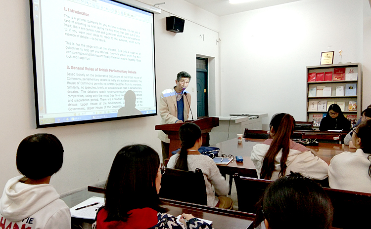 高勇首先邀请部分学生就给定辩题阐明观点并予以论证,随后围绕这些观点及论证进行了深入的探讨和辩论,指出辩论的关键在于利用充分的前提条件和强有力的论据进行佐证,并提出了“四个三角”的理论,使大家对英语辩论的技巧有了进一步的认知。