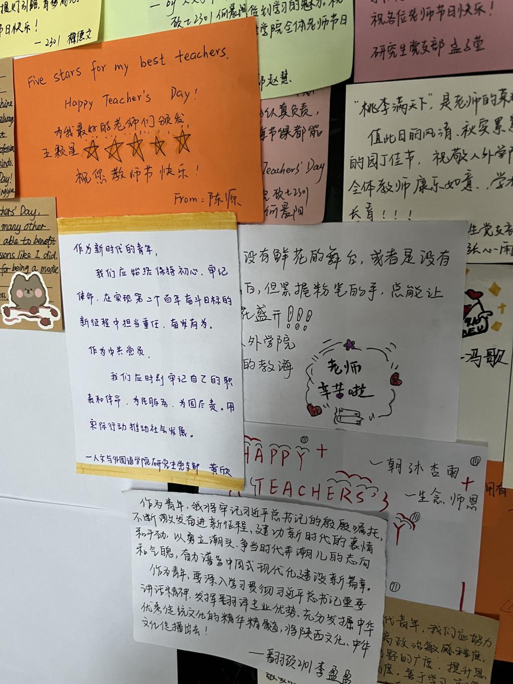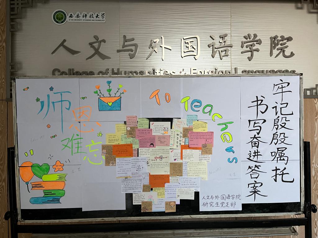 伟大事业孕育伟大精神,肩负着筑梦人的使命,学院教师们用各自不同的方式耕耘奉献,以爱和坚守诠释了对教育事业的热爱。支部党员精心准备了一面展示板,一张张承载着感情的纸条拼成爱心的形状,书写了大家对教师的感激与祝福。党员们还结合习近平总书记在听取陕西省委和省政府工作汇报时的重要讲话精神,用一段段满怀热忱和希望的文字,表示研究生党员将牢记总书记的殷殷嘱托,继承和发扬党的优良传统,学习贯彻习近平新时代中国特色社会主义思想,在以学铸魂、以学增智、以学正风、以学促干上下功夫见实效,努力成为新时代具有责任意识和创新精神的建设者,为奋力谱写中国式现代化建设的陕西篇章贡献青春力量!