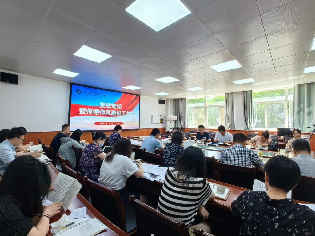5月22日下午,人外学院在骊山校园2教226会议室召开理论学习中心组(扩大)学习会暨师德师风建设工作会,学院班子成员、党委委员、各党支部委员、各系部室主任参加了会议。