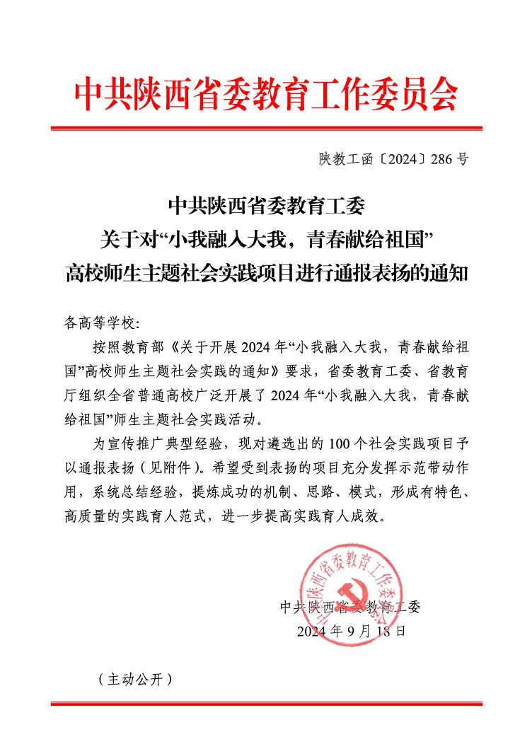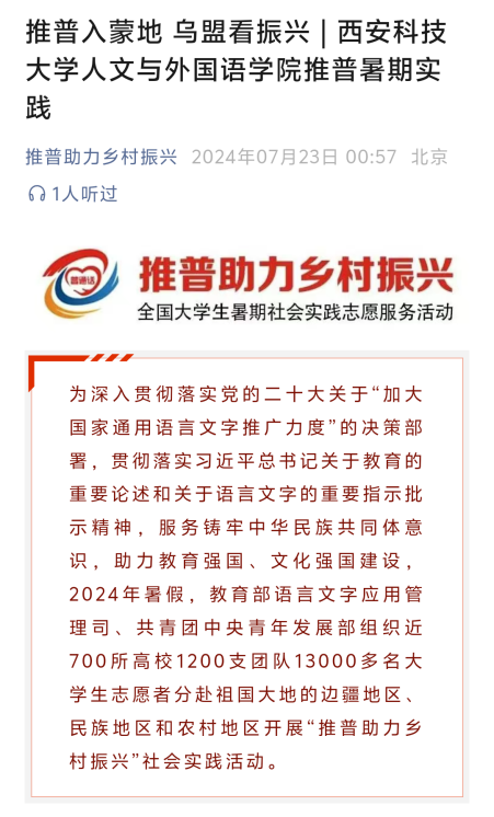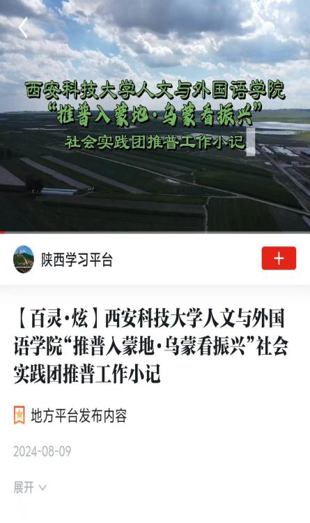 近日,陕西省委教育工委、省教育厅面向全省普通高校组织开展2024年“小我融入大我,青春献给祖国”高校师生主题社会实践活动,最终遴选出100个优秀案例。开云官网申报的《深入边疆少数民族地区推广普通话,助力基层语言文化交流传播》获优秀案例。