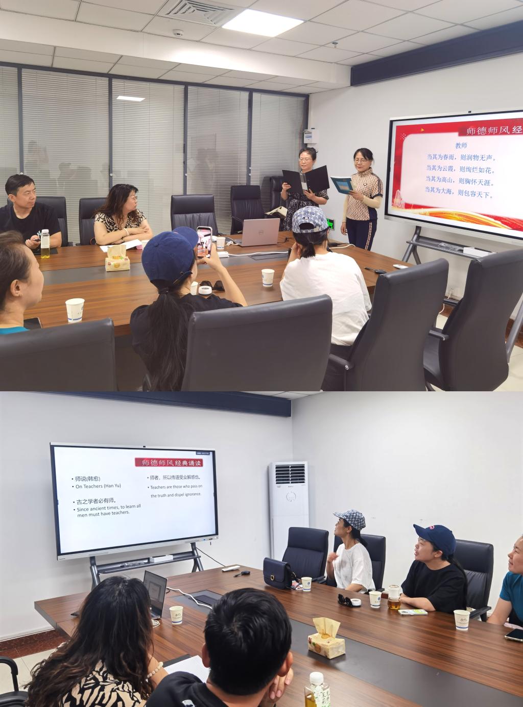 主题活动分三项进行。第一项是“强师德铸师魂”中英文经典诵读。李怡和张小涓两位教工党员通过一首中文诗朗诵探析、诠释师德——不浮、不媚、不妄、不躁,讲真言,是真学,有实干;不瞒、不腐、不熔、不懒,学真理,用真情,做真人。诗歌弘扬守纪正风,赞美敬师爱岗、修身立德精神,激发共情,与会党员教师两两组合,接龙即兴诵读中英文经典:韩愈《师说》。