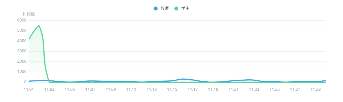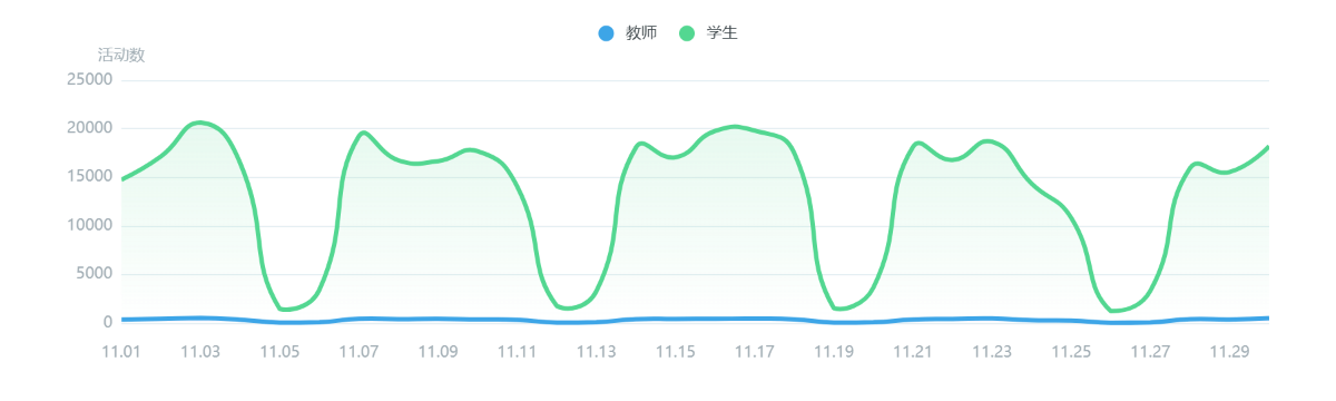 超星教学平台运行课程2080门,资源上传7484个,运行班次3593个,课堂活动351300人次。11月28日本月度达最高教师访问量(PV) :87871,发布活动9236个,发起讨论2796个,发布作业1656个,批阅作业21276人/次。11月19日本月度达最高学生访问量 (PV) :6524644, 完成任务点2172628人/次,参与活动393727人次,学生讨论144708人次,完成作业100060人/次。