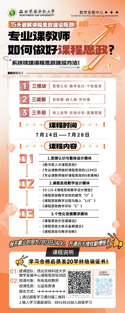 为进一步提升bat365官网教师队伍的教学水平与育人能力,促进教师专业发展,加强校际间的交流与合作,学校决定依托西北农林科技大学教师发展中心的优秀教发团队与丰富的课程资源,开展暑期教师培训活动。现将有关事项通知如下: